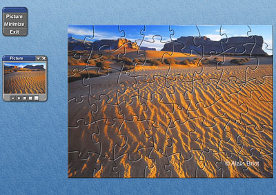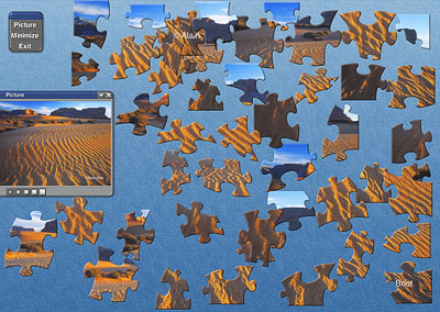 Screen views of the Sand Dunes puzzle scattered and completed are displayed below.