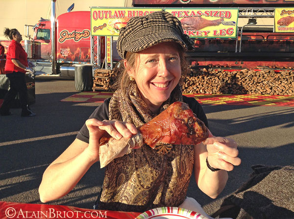 Natalie eating a turkey leg at the 2015 Barrett Jackson car auction show