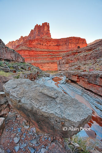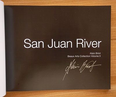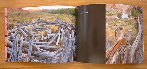 The photographs in this Booklet were created during my first exploration of the San Juan River in October 2005 This exploration proved so exciting that I returned this year for a second and longer time. The booklet was created on my Macintosh G5, and took only a few days to assemble and send to printing. This is another interesting aspect of the project: I assumed a book project was a daunting task. In fact, it can be done quite simply and easily, if one follows the approach I did for this book. The images are either printed half-page, full page, or panoramics across two pages. Here is one of the two-page spreads from the booklet: