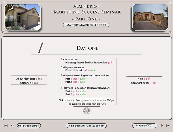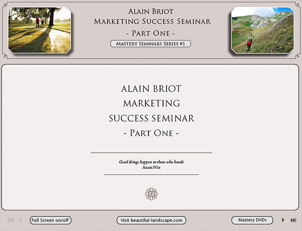 if you do not have a DVD reader in your computer, or if you prefer USB flash cards to DVD, we can ship the Marketing Success Seminar: Part 1 on a USB Flash card instead of on a DVD. If you want to take advantage of this option, simply place your order using the link above, then email us at alain@beautiful-landscape.com to let us know that you want your order delivered on a USB Flash Card rather than on DVD. The cost is the same.