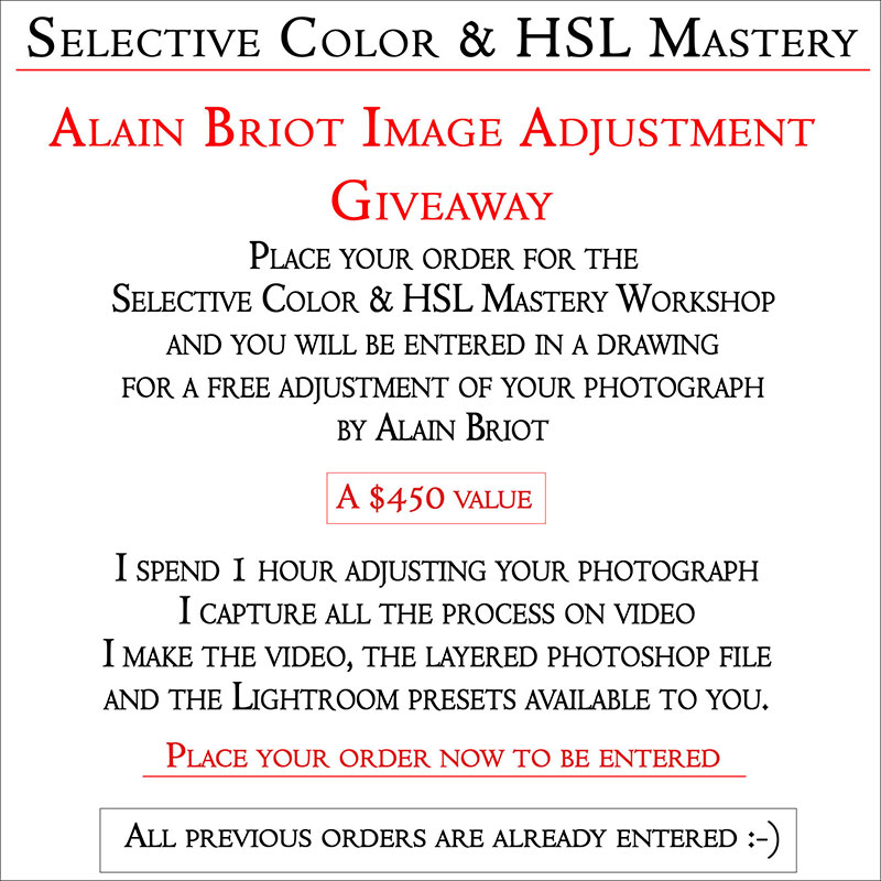 All Selective Color & HSL Mastery orders are entered in a drawing for a free Photograph Adjustment by Alain Briot. Entry in this drawing is free with your purchase of the Selective Color & HSL Mastery Workshop on USB or DVD.
