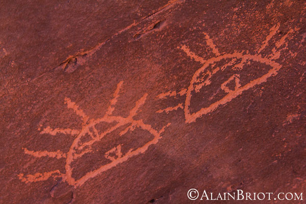 The goal of photographing this site with the camera tilted was to give me creative freedom. Instead of following the vertical orientation chosen by the ancient artists who carved these images in the sandstone, I was able to bring my own inspiration by choosing the direction I wanted to give them.