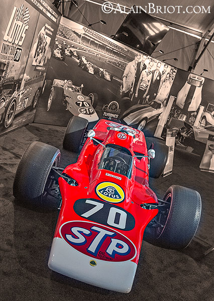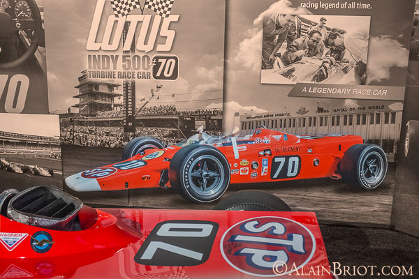This photograph shows the Lotus Type 56-3 'Wedge' turbine car that raced at the 1968 Indy 500 with Graham Hill at the wheel. The car was propulsed by a turbine jet engine with the exhaust located on top of the car, right behind the driver's head. It qualified at 171,208 mph, a track record at the time. Unfortunately the car was forced to retire due to mechanical problems and did not finish the race. The car, now part of the Andy Granatelli turbine cars collection, was recently restaured by Clive Chapman and Vince Granatelli.