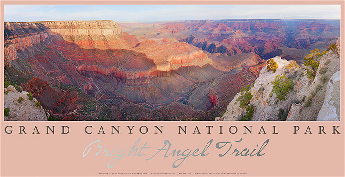 This poster showcases this unique photograph showing the entire length of the trail from the South Rim to the North Rim. The poster faithfully reproduces the colors of the original fine art print. The size of the poster is 20x39. The lettering is particularly attractive and stretches the whole length of the poster.