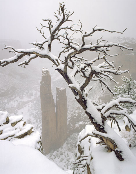 This photograph was created when I lived in Chinle, at the mouth of Canyon de Chelly, on the Navajo reservation. A snowstorm had fell over the canyon the night before, and continued on in the morning. In the Southwest, especially in this period of drought (Arizona is on the 9th month of a drought), snow is uncommon, especially heavy snowstorms. I knew the opportunity was unique and could not be missed. I immediately got in my truck and drove towards Spiderock knowing that this location, being at the highest elevation in Canyon de Chelly, was getting the most snow.