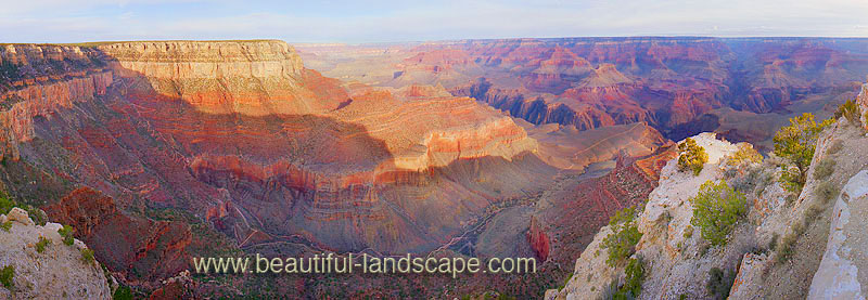 The Bright Angel Trail is so long, nearly 20 miles, that seeing it's entire length from either the North or the South Rim is extremely challenging. I found the only overlook that allows you to see as much of the Bright Angel Trail as possible from the South Rim. I used a large format panoramic camera to capture this breathtaking view of the Bright Angel Trail. I captured it at sunrise when the colors are at their peak.