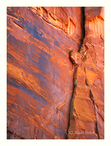 To me what I like most about this image are the colors. The reds, the yellows and the blues, the blues being reflections of the open sky on the black areas of Desert Varnish that partially cover the sandstone wall. These colors remind me of colors found in Navajo rugs, or Navajo jewelry, expecially inlaid jewelry. Seeing this wall gave me an insight on where the Navajos find inspiration for their work, be it weaving, jewelry, paintings, or other. They find their inspiration in the landscape they inhabit. They find inspiration in their land, in the clouds and in the earth, and in the canyon walls that tower over their hogans.