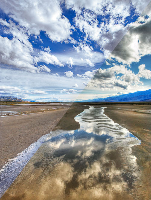 This image was created during the same photography expedition as Zabriskie Point, the April 2006 Print of the Month. In fact, Playa Reflections was created the day before I created Zabriskie Point . Just like Zabriskie Point , numerous adjustments had to be made to this image to make it match my original vision. My vision was for the sky and the reflections in the water to match each other in intensity, so as to create a mirror-like effect. I also saw this image as a composition in blue. It took a lot of work and knowledge to achieve that. For this reason, and to help you study and learn how you can do this yourself, I am including the master file for this image at no extra cost. This is the third photograph for which I am including the Master File, the two others being the April and May Prints of the Month.