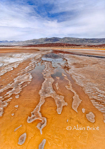 On the day I arrived in Death Valley in 2007 I immediately drove to the location where I created Playa Reflections in 2006. There I was excited to find numerous pools and streams of water. Those were shallow, but the patterns in them were fantastic. The sky was not as cloudy as the month before, but I was able to work the scene so as to make the best out of the situation, using the patterns in the sand and the water in conjunction with the patterns of the mountains and the clouds to form a composition where all the elements came together. I used yellow and blue as my primary colors, playing on the opposition of these colors to create tension in the image. The clouds required the most care in order to render the softness and the movement I captured without losing detail or without making the sky too light or too dark. The water in the foreground is the key to the image, the luminescence in the water being what first attracted me to this image.