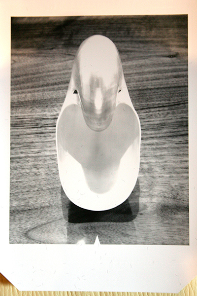 I quickly determined that the camera and lens were in superb condition.The following image is a snapshot of the positive of perhaps the third Polaroid I shot. When I first saw the image, I was disappointed in that I felt the wood grain detracted from the pure form of the nautilus shell - the background was too busy. Also, the reflections off the gloss surface of the polished wood did not provide sufficient contrast to the white of the nautilus. That the shallow depth of field left part of the platform in sharp focus and some out of focus was also distracting. Finally, the image seemed to me to be more clearly and recognizably a shell sitting on a platform. And I decided to move away from that.