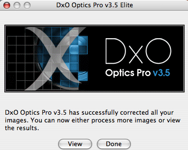DxO also has a unique approach to single-image or batch processing. The application quits while the processing is being done, and is replaced by a progress bar showing you how many images have been processed and how far along the conversion process is for each image. This means that work has to stop while DxO converts the image.