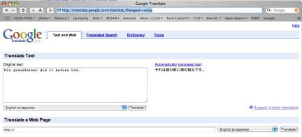 My strategy with Google translation was to enter an English phrase, and then translate to Japanese and then back to English to verify that the translation was approximately correct. I would then modify the phrase and sentence structure until I got a replay back of the original English. For the phrase Ken ponders the essence of wine I instead got back: Ken is the essence of wine on the brain.I decided to keep the original phrase that resulted in the unintended Japanese meaning.