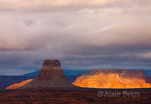 At our last stop for the day the sun played hide and seek, illuminating the cliffs in the distance alternatively to the right and to the left of Tower Butte, the tallest rock formation in the photograph above. Several participants told me they were hoping that the sun would eventually light the Tower itself while leaving everything else in the shade. I personally know that when dealing with Nature personal desires are futile and that it is best to sit back and enjoy the show, so to speak. So I left desire aside and concentrated on capturing what was offered to me. This image came just before the sun left for good on that day. After I captured it the cliffs behind Tower Butte started loosing direct light until, progressively, everything was but a shade of dusty gray.